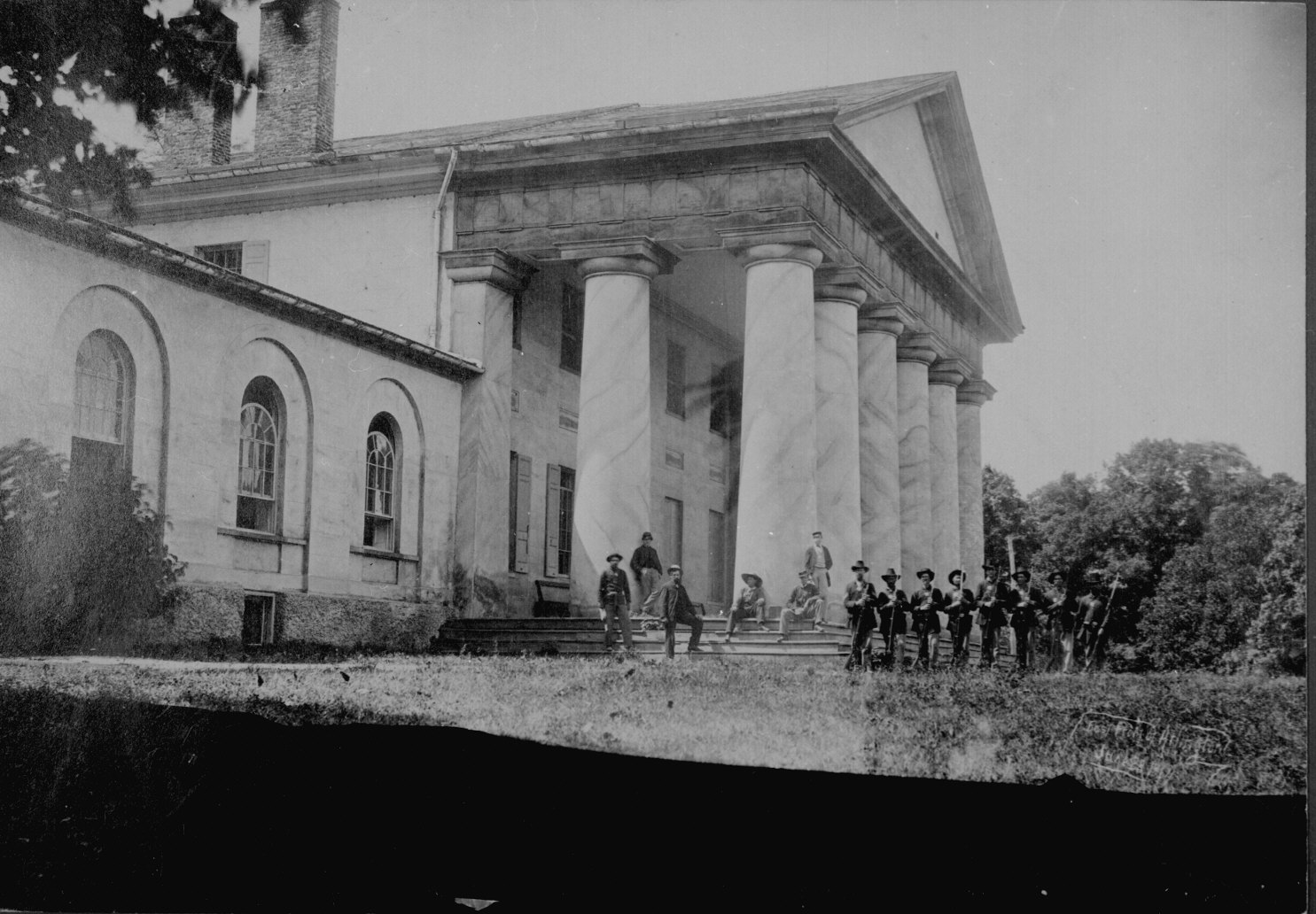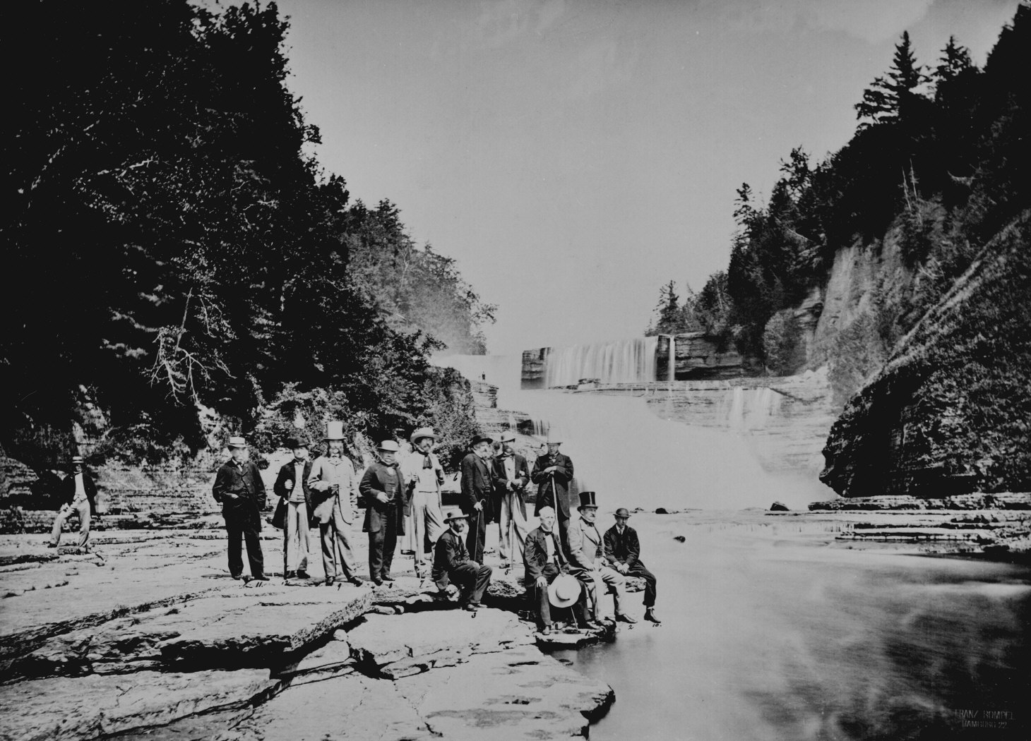 29. Diplomats at the foot of an unidentified waterfall, New York State, August 1863. Left to right: unidentified; State Department messenger Donaldson; unidentified; Count Alexander de Bodisco; Count Edward Piper, Swedish Minister; Joseph Bertinatti, Italian Minister; Luis Molina, Nicaraguan Minister (seated); Rudolph Mathias Schleiden, Hanseatic Minister; Henri Mercier, French Minister; William H. Seward, Secretary of State (seated); Lord Richard Lyons, British Minister; Baron Edward de Stoeckel, Russian Minister (seated); and Sheffield, British attache. 59-DA-43. (civil_war_029.jpg)