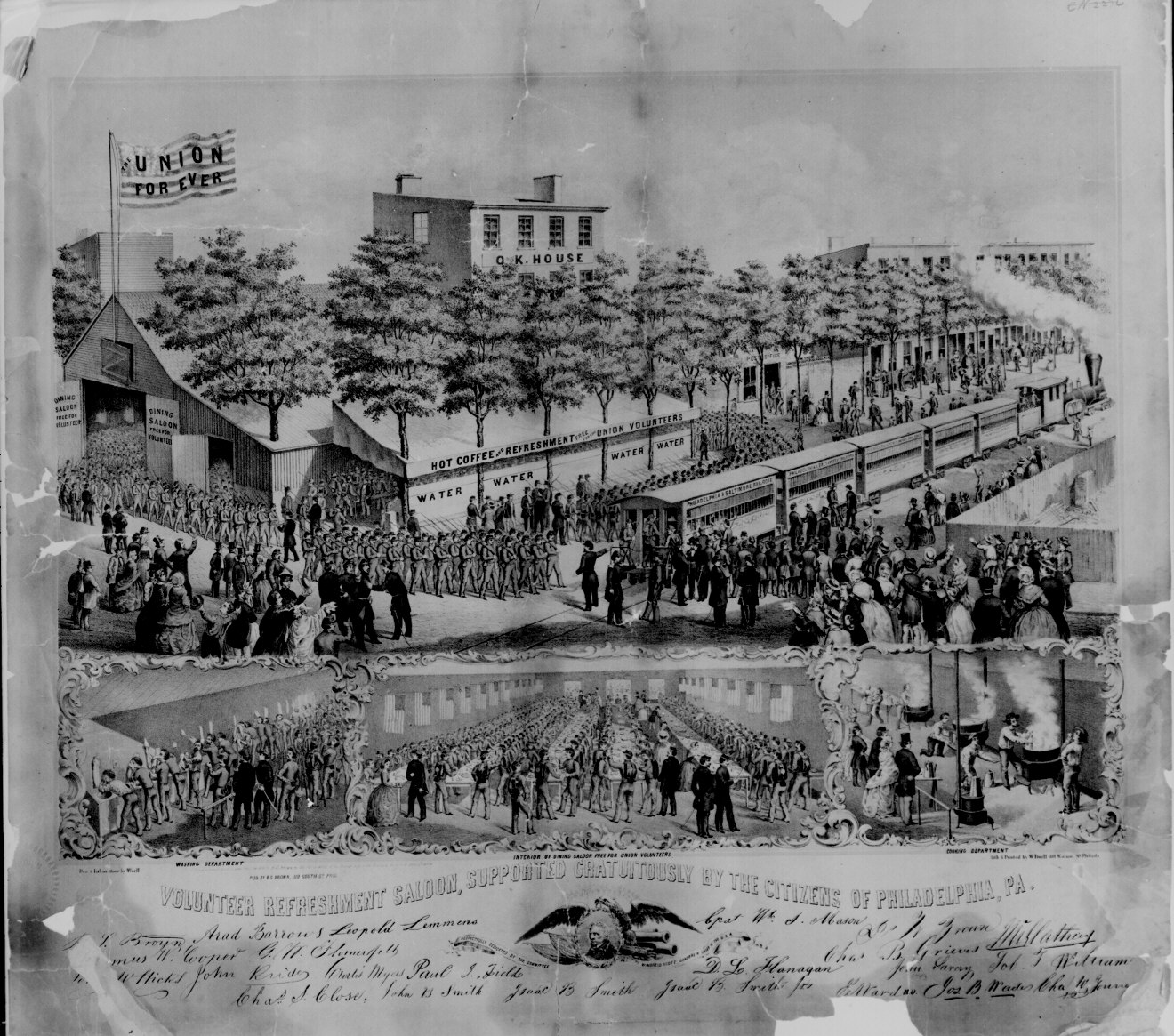 39. "Volunteer Refreshment Saloon, Supported Gratuitously by the Citizens of Philadelphia, Pennsylvania." The picture includes a view of the outside and three small views of the inside. Lithograph by W. Boell, 1861. 15-M-40. (civil_war_039.jpg)