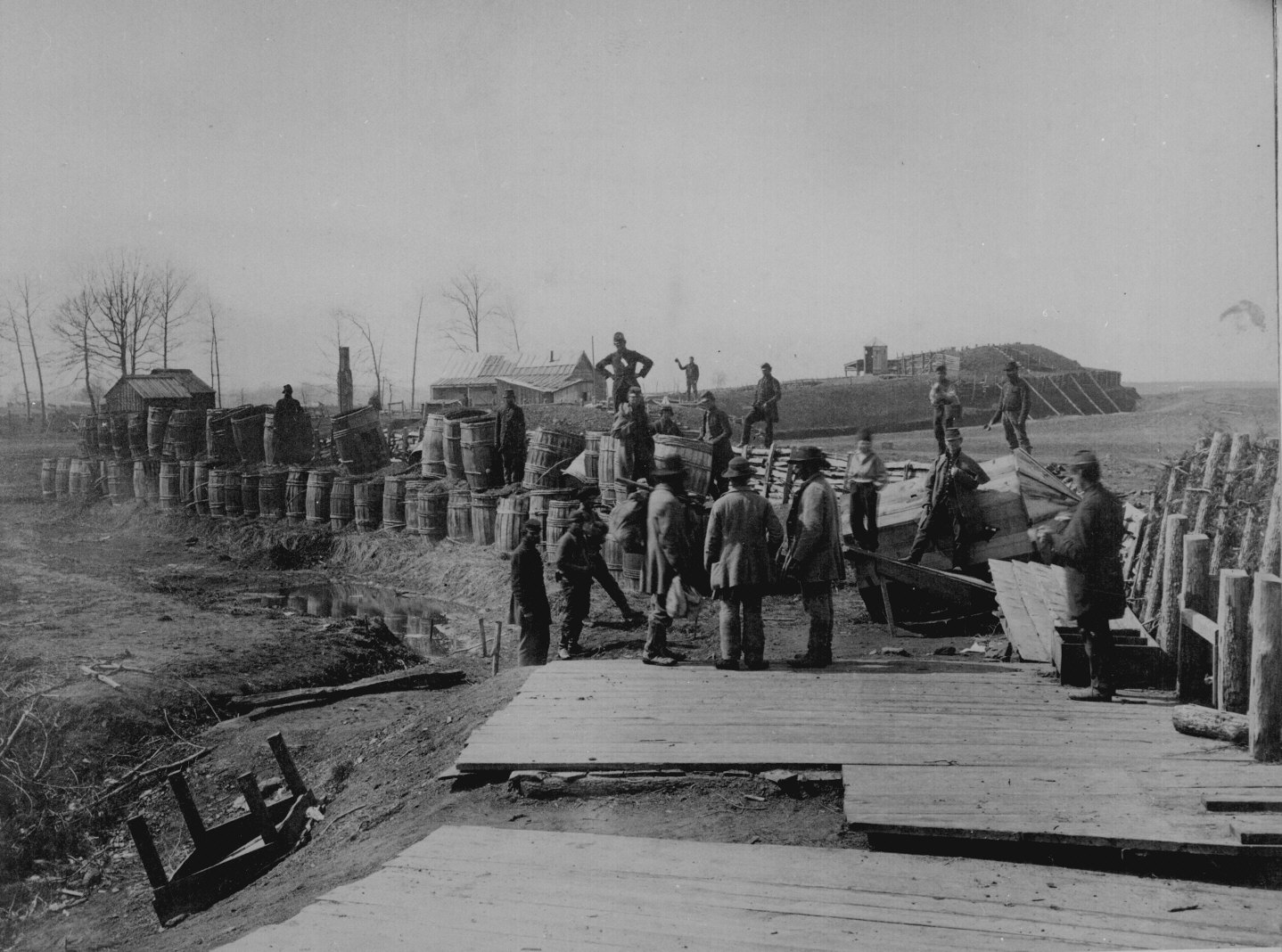 55. A Union station on the James River established for extracting gunpowder from Confederate torpedoes, 1864. Photographed by Egbert Guy Fox. 111-B-434.