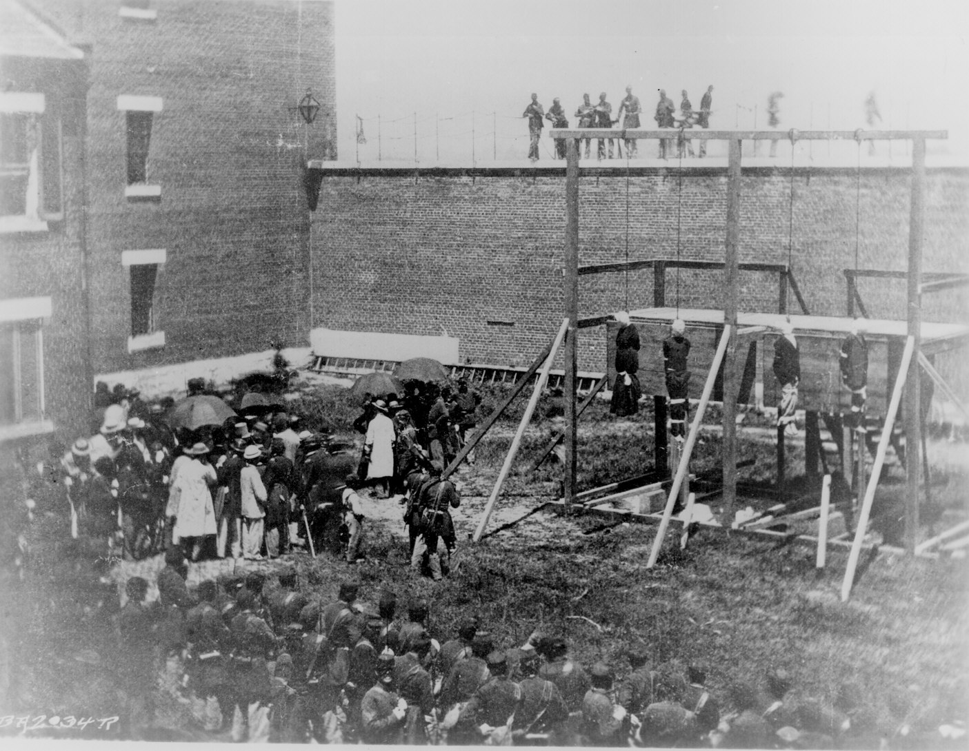 201. Execution of the four persons condemned as conspirators (Mary E. Surratt, Lewis T. Powell, David E. Herold, and George A. Atzerodt), July 7,1865. Photographed by Alexander Gardner. 111-BA-2034.